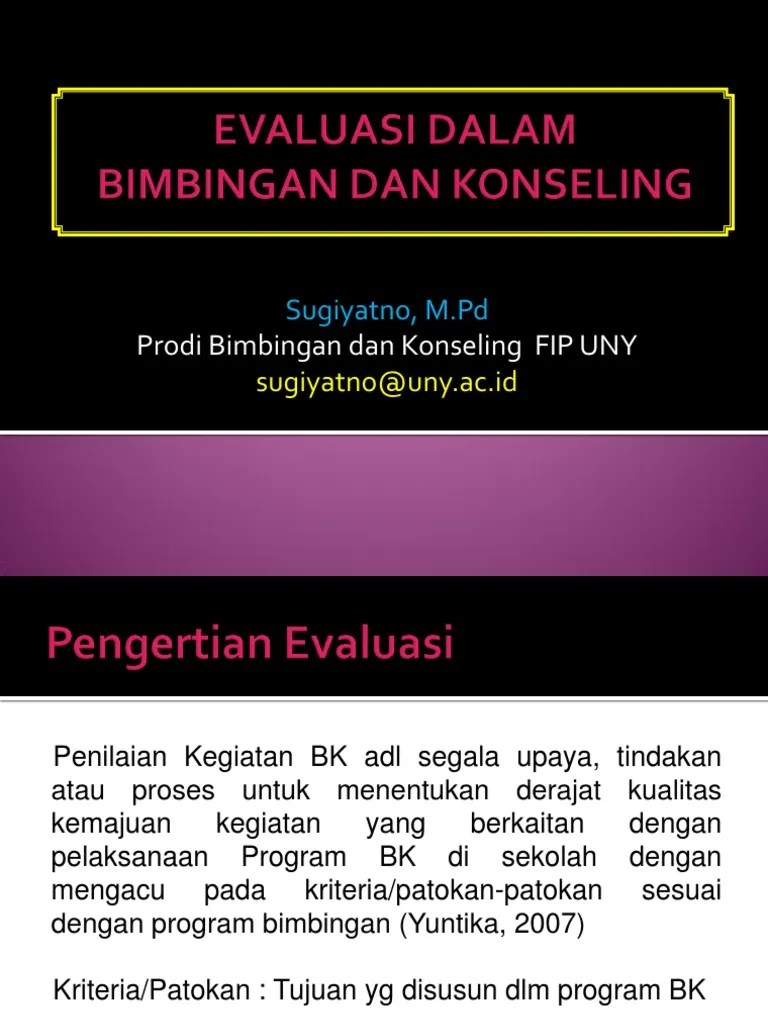 Jurusan bimbingan dan konseling fakultas tarbiyah dan . 2011) menjelaskan bahwa ada sekitar 50 lebih model evaluasi yang . Keterampilan guru bk dalam melakukan evaluasi program bimbingan dan konseling. 0:00 / 5:54•watch full video. Evaluasi pelaksanaan program bimbingan dan konseling di sman 1 menganti, sman 1 driyorejo, dan sma al azhar menganti kabupaten gresik.