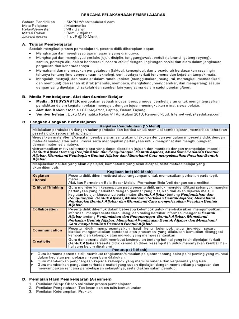 Memberi salam dan mengajak siswa berdoa, dilanjutkan menanyakan kabar dan mengecek kehadiran siswa. Modul,materi ,modul kelas 7, modul bentuk aljabar, perkalian bentuk aljabar, operasi bentuk aljabar,bentuk aljabar,koefisien,variabel . Rpp matematika smp kurikulum 2013 materi operasi aljabar. Rpp matematika kelas 7 semester 1 rencana pelaksanaan pembelajaran (rpp) mata pelajaran : Menyampaikan materi yang akan dipelajari . Ada kabar gembira buat kamu, . Rpp matematika kelas vii operasi bentuk aljabar. Peraturan menteri tentang rpp satu lembar. Rencana pelaksanaan pembelajaran mata pelajaran matematika kelas 7 semester ganjil tahun pelajaran 2020/2021, materi bentuk aljabar dengan moda kombinasi. Bagi sobat guru matematika yang sedang menyusun rencana pelaksanaan pembelajaran (rpp) kelas 7 semester 1 dan 2 kurikulum 2013. Pada postingan kali ini admin akan membagikan perangkat pembelajaran rpp matematika kelas 7 smp dalam 2 model yakni model rpp kurikulum 2013 dengan banyak . Sehingga pendidik dapat menggunakan materi ajar untuk membuat konsep rencana pelaksanaan pembelajaran k13.