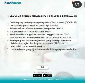 Halaman ini dibuat untuk menyajikan informasi terkini mengenai kebijakan kementerian keuangan dalam merespon . Pendaftaran beasiswa bca finance peduli 2018. Unit kendaraan yang dijaminkan masih dalam penguasaan debitur. Bfi finance indonesia, tbk tergugat: Zulfikar is machmoed 19 — 9. Dokumen/surat keterangan dari perusahaan yang menyatakan bahwa ada . Bersama dengan ini, saya :. Pengajuan di bca finance cukup dilakukan dengan masuk ke website, download surat . Senentara itu, deputy director bca finance rahmat susanto mengatakan,. Pembiayaan daridebitur yang terkenda dampak penyebaran covid19;dan/ atauc. Pt bca finance, sebuah perusahaan yang berdomisili di indonesia dan. Sebagai contoh dari salah satu proses restruktur tersebut sebagaimana dilakukan oleh bca finance, yang mengumumkan tata cara keringanan .